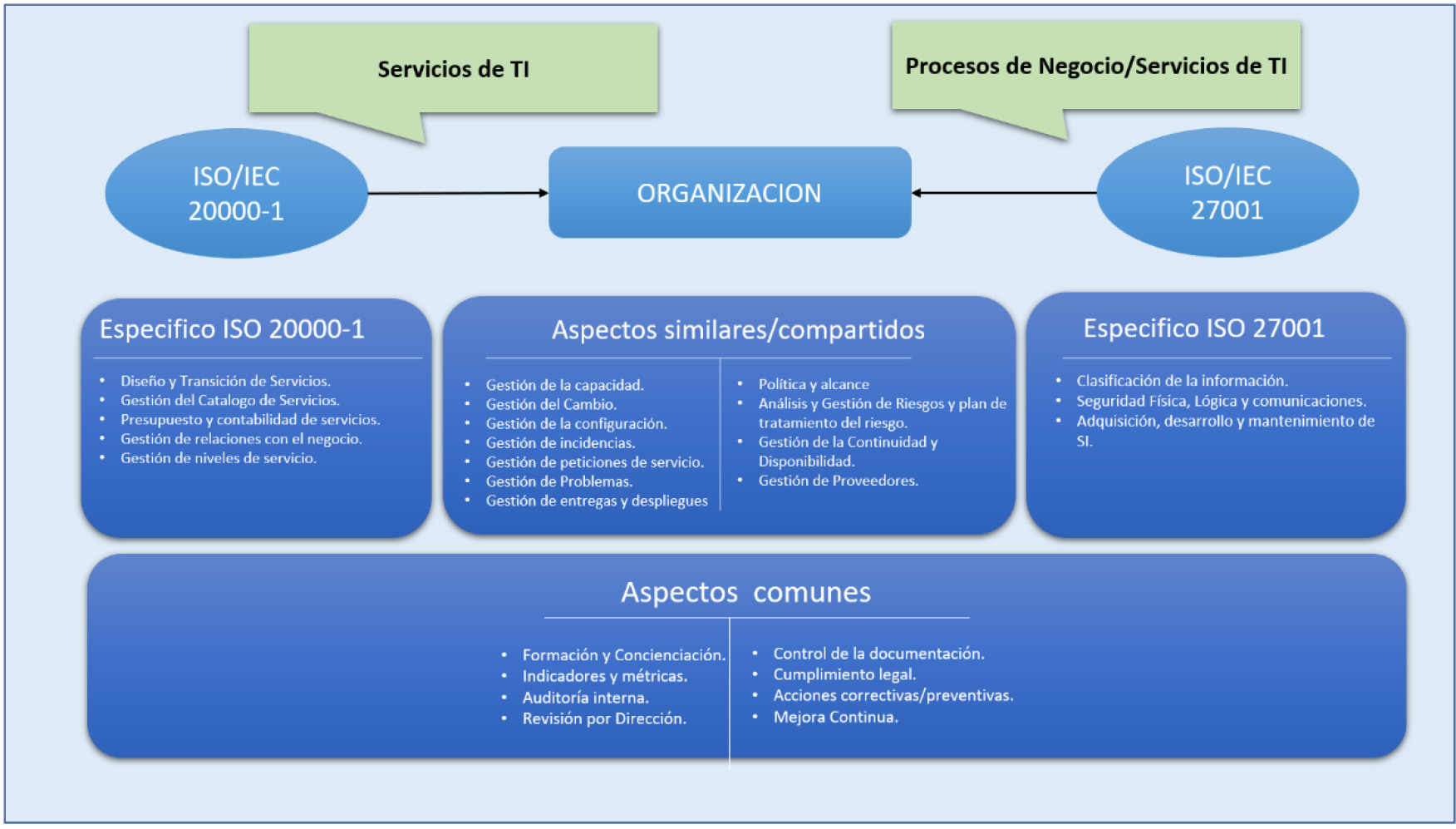 Figura 1. Aspectos comunes, compartidos y diferenciales de ambas normas – ISO 20000-1 e ISO 27001.