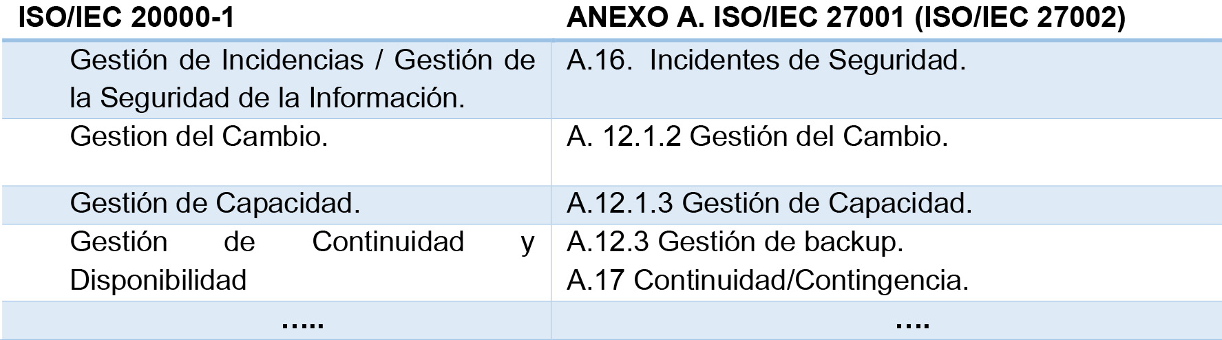 Adicionalmente, podemos ver en la siguiente tabla orientativa (Tabla 2) un ejemplo no exhaustivo de procesos de la ISO 20000-1 que se corresponden con controles del Anexo A. ISO 27001 (ISO 27002)
