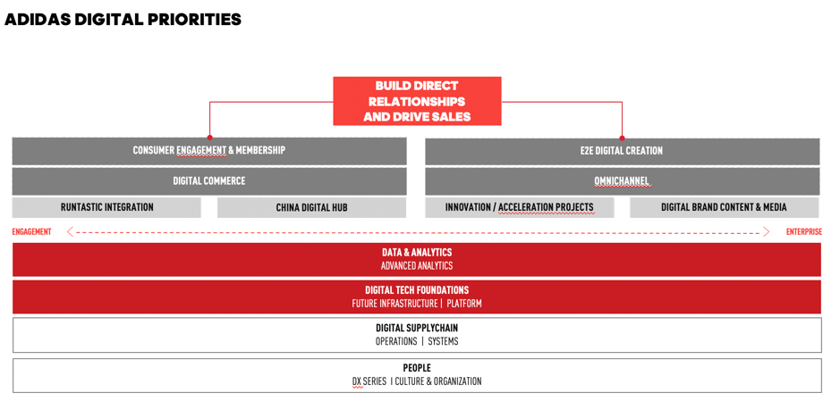 El continuo crecimiento ha llevado a Adidas a una transformación en su organización. Adidas ha evolucionado a un modelo basado en value streams, donde los productos se organizan alrededor de Product Owners de negocio. Se crearon equipos de plataforma / habilitación organizados alrededor de capacidades técnicas que colaboran con los diferentes value streams con el objetivo de hacerles independientes y que maduren sus capacidades DevOps. El trabajo técnico y de habilitación es priorizado gracias a la iniciativa fundacional “Digital Tech Foundations” que soporta el resto de las áreas digitales de la empresa: