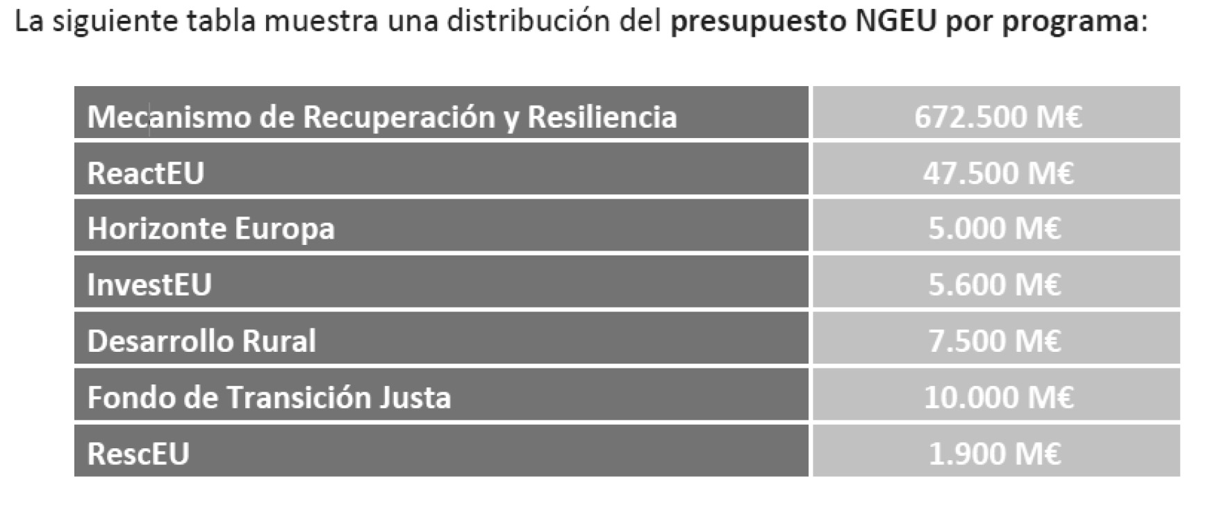 - Por otro lado, Next Generation EU (NGEU en adelante) es el instrumento de recuperación puesto en marcha por la Unión Europea para hacer frente a las consecuencias socioeconómicas de la crisis del Covid-19 y poder hacer que las sociedades europeas puedan estar más preparadas a las nuevas oportunidades en las transiciones digitales y económicas y además puedan ser más resilientes y sostenibles. NGEU estará dotado de un presupuesto de 750.000 millones de euros a ejecutar entre los años 2021 y 2023.