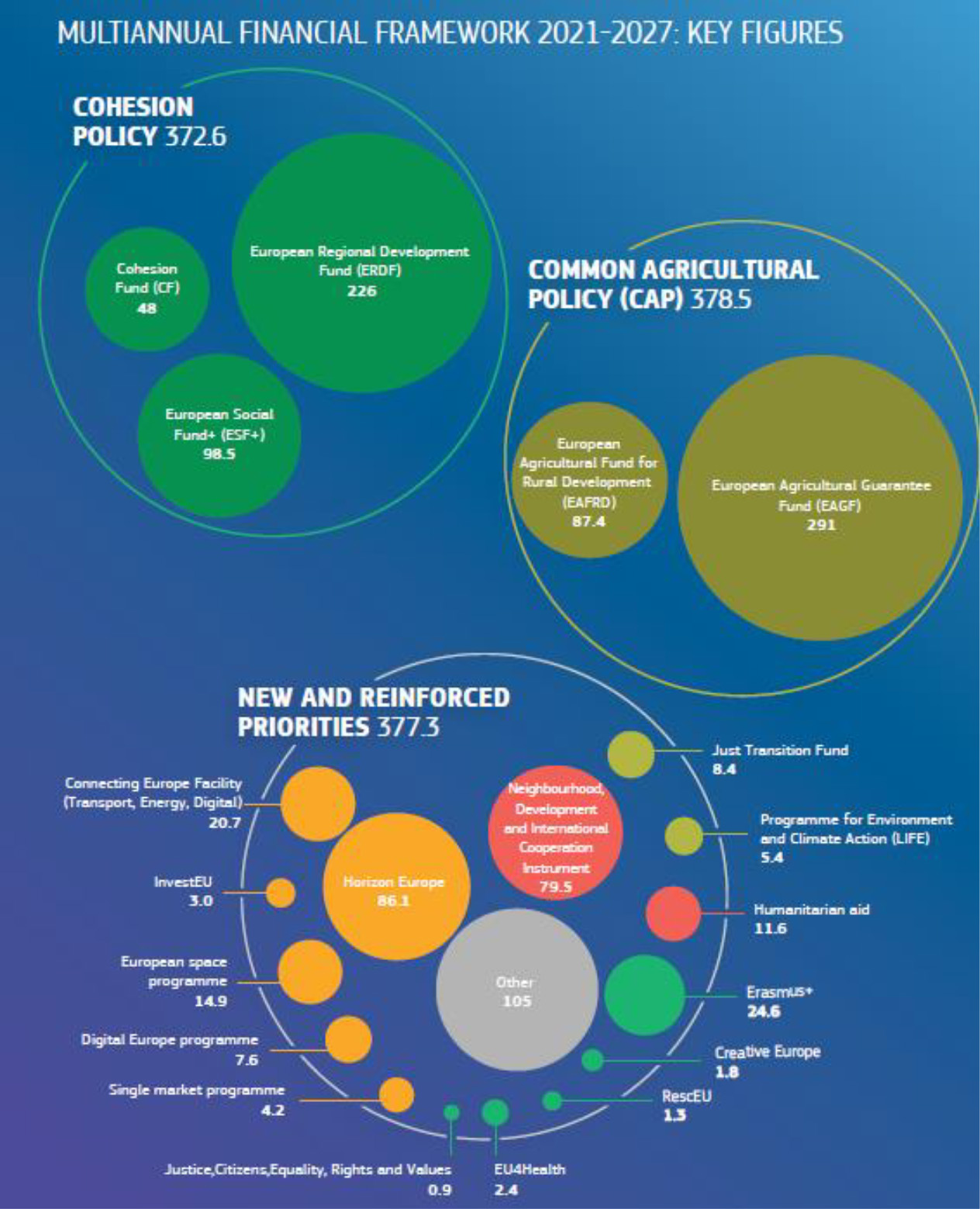- 1,1 billones de euros destinados al Marco Financiero Plurianual (2021-2027).