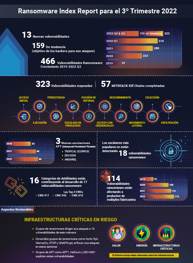 Los grupos de ransomware siguen creciendo en volumen y sofisticación, con 35 vulnerabilidades asociadas a este tipo de malware en los tres primeros trimestres de 2022, y 159 explotaciones activas. Para complicar más las cosas, la escasez de datos y el contexto actual de las amenazas está dificultando que las organizaciones parcheen eficazmente sus sistemas informáticos y mitiguen la exposición a la vulnerabilidad.
