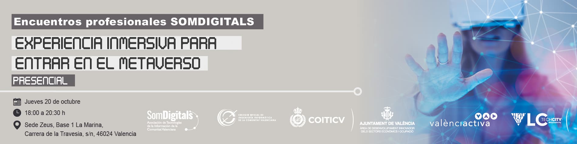 Dentro de la serie de encuentros profesionales SOMSDIGITAL del COIICV y COITICV el jueves 20 de octubre 2022 de 18:00 a 20:30h se celebrará en formato presencial en La Maria de Valencia el evento titulado: «Experiencia Inmersiva para Entrar en el Metaverso» al que os animamos a asistir.