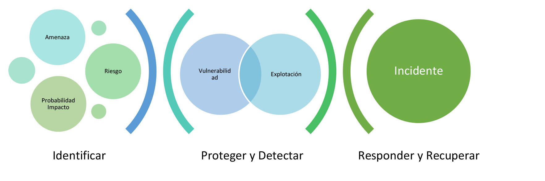 Espero que se haya entendido esta aproximación tan utilizada en diferentes marcos de trabajo y la integración de conceptos claves como amenaza, probabilidad, impacto, riesgo, vulnerabilidad, explotación e incidente en estas funciones básicas de la ciberseguridad.