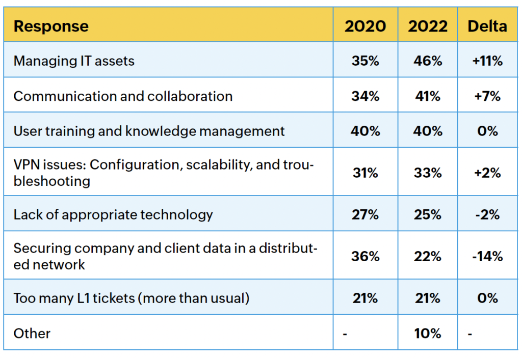 También hay margen de mejora en muchas organizaciones, ya sea en relación con las políticas de usar dispositivos particulares (BYOD),la provisión de activos con capacidad móvil, el éxito con el autoservicio y los chatbots , la mayor inversión en la planificación de la continuidad del negocio o cualquier otra área que afecte a la prestación de servicios de TI y al soporte.