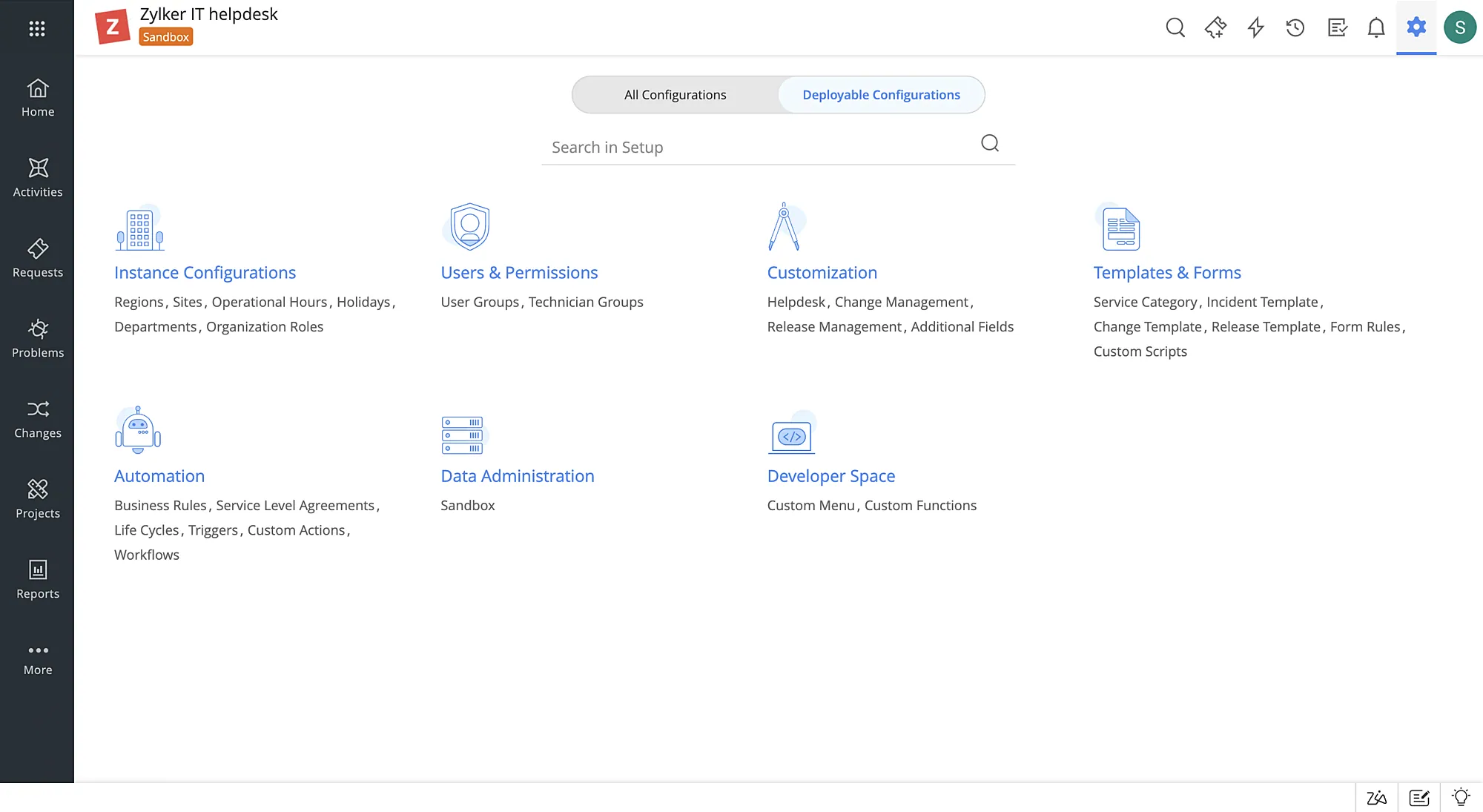 Se puede aprovechar el sandbox para configurar y probar las configuraciones de varias prácticas de ITSM en un entorno de service desk en paralelo. De esta forma, se reducen los errores en el desarrollo y las interrupciones posteriores a la implantación mediante el seguimiento de las modificaciones de la configuración y la localización eficaz de los fallos en una fase temprana.