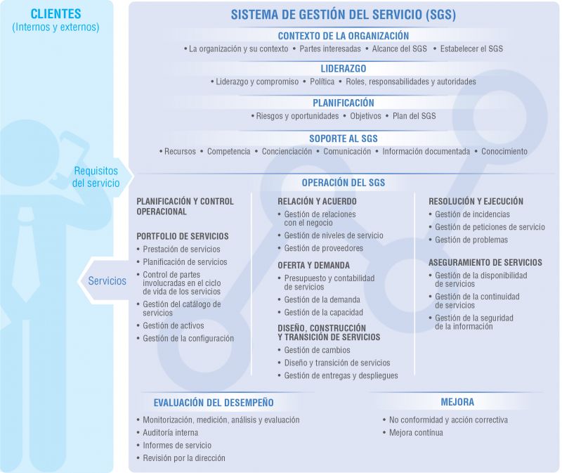La última revisión del estándar de servicios de TI, ISO 20000-1 Sistema de Gestión de Servicios de TI, se adapta y permite, además de lo anterior, que la organización oriente sus servicios de TI a los objetivos de negocio, dando un servicio con la máxima calidad y seguridad, tanto a la propia organización, como a sus clientes y Stakeholders, minimizando los riesgos de TI y considerando la mejora continua de sus procesos y servicios en esta era digital y en estos tiempos de pandemia. Se puede comprobar su estructura de procesos y relación con Stakeholders en la Figura. 1)